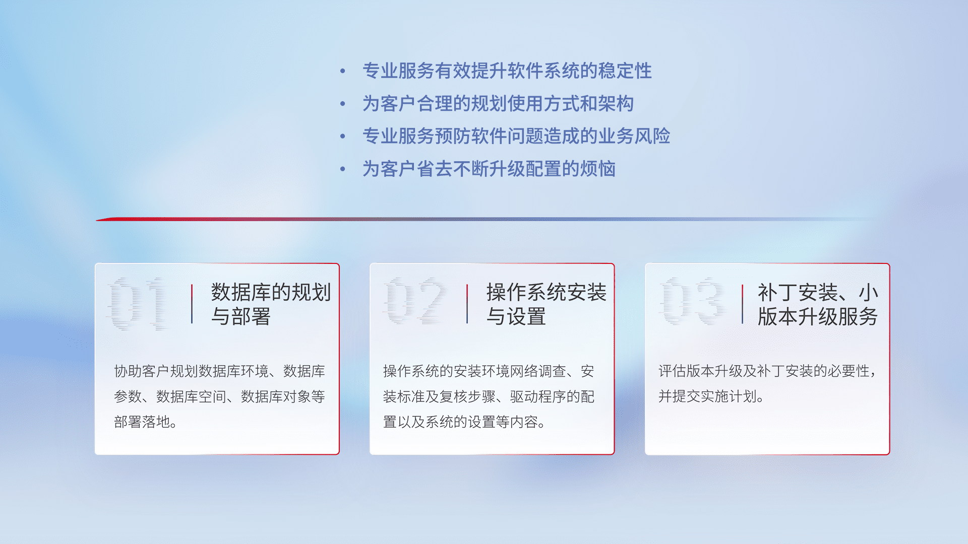为客户提供软件规模升级、、、、快速部署、、、按需配置的专业服务,,,,从数据库的规划与部署到操作系统的安装与设置,,,,再到补丁安装和小版本升级提供支持。。